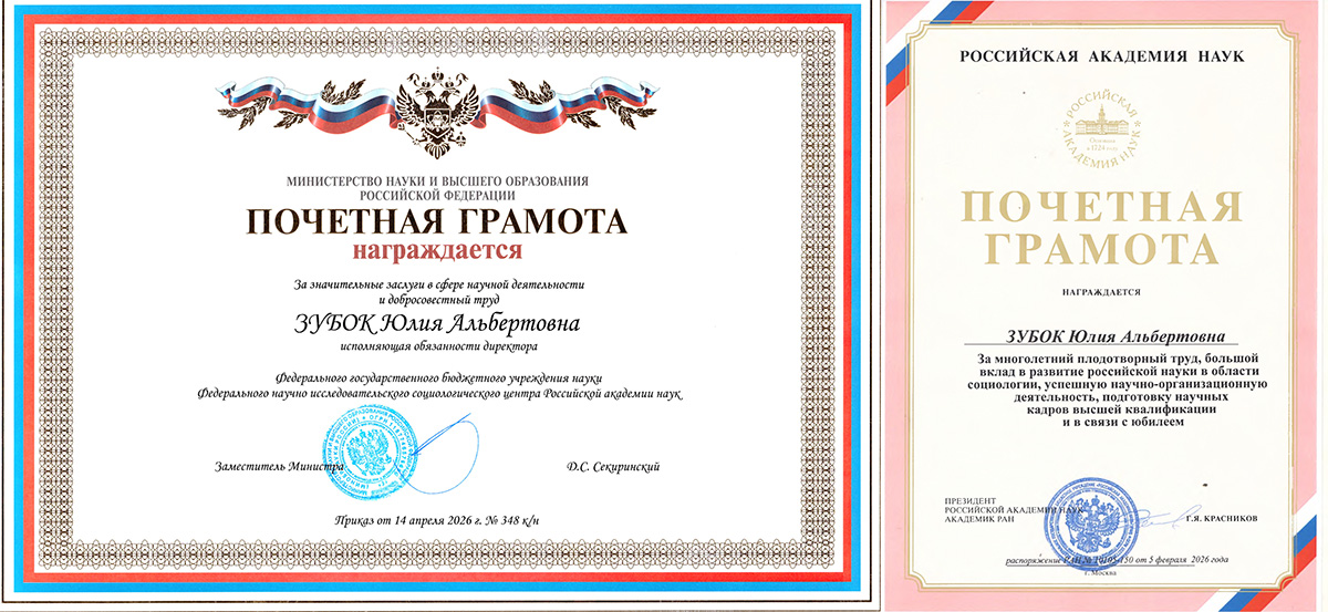 Зубок Ю.А. награждена Почетными грамотами Минобрнауки и РАН Юлия Альбертовна Зубок, доктор социологических наук, профессор, и. о. директора ФНИСЦ РАН, руководитель Центра социологии молодежи Института социологии ФНИСЦ РАН награждена Почетными грамотами Министерства науки и высшего образования РФ и Российской академии наук. Поздравление с юбилеем от Заместителя президента РАН, Акдемика-секретаря Отделения общественных наук РАН, академика РАН Т.Я. Хабриевой к списку