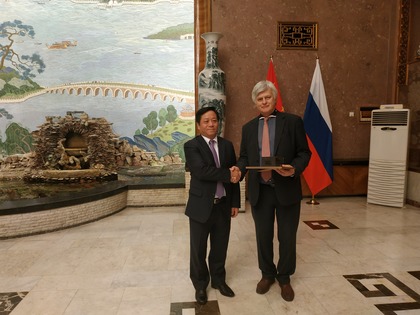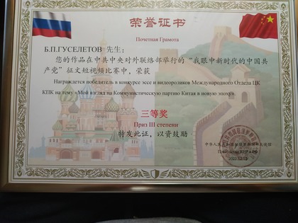 Б.П. Гуселетов награжден почетной грамотой международного отдела ЦК Компартии Китая за победу в конкурсе эссе и видеороликов на тему «Мой взгляд на Коммунистическую партию Китая в эпоху перемен» 13 декабря 2022 года руководитель отдела политологии, главный научный сотрудник ИСПИ ФНИСЦ РАН, д.полит.н. Б.П. Гуселетов посетил Посольство Китая в Москве по приглашению Чрезвычайного и Полномочного Посла КНР в России Чжан Ханьхуэя. Посол Чжан Ханьхуэя вручил Гуселетову Б.П. почетной грамотой международного отдела ЦК Компартии Китая за победу в конкурсе эссе и видеороликов на тему «Мой взгляд на Коммунистическую партию Китая в эпоху перемен». Господин Чжан Ханьхуэй отметил, что сотрудничество между Россией и Китаем развивается в последние годы очень успешно и поблагодарил Б.П. Гуселетова и остальных лауреатов конкурса за их вклад в эту работу. В ответном слове Б.П. Гуселетов поблагодарил Посла Чжан Ханьхуэя и руководство ЦК КПК за высокую оценку его статьи «Коммунистическая партия Китая в новую эпоху: взгляд из России», которую он подготовил для участия в данном конкурсе. Он также отметил важность сохранения и дальнейшего развития научного сотрудничества между представителями Российской академии наук и Китайской академии общественных наук. к списку